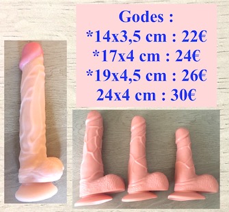Description : Gode imitation pénis avec testicules. Sextoy mixtes. Produit neuf sous blister. Son design semi-réaliste avec une texture nervurée répondra à toutes vos envies. Possède une ventouse pour l'utiliser aisément sur toute surface. 4 modèles disponibles : *taille : 14 x 3, 5 cm : 22 €. *taille : 17 x 4 cm : 24 €. *taille : 19 x 4, 5 cm : 26 €. *taille : 24 x 4 cm : 30 €. Possibilité de venir les voir sur place. Valeur d'origine du plus petit : environ 50 €. Règlement possible : PayPal, chèque... ou espèces sur place. Livraison (emballage discret) : Poste ou Mondial Relay : 5€